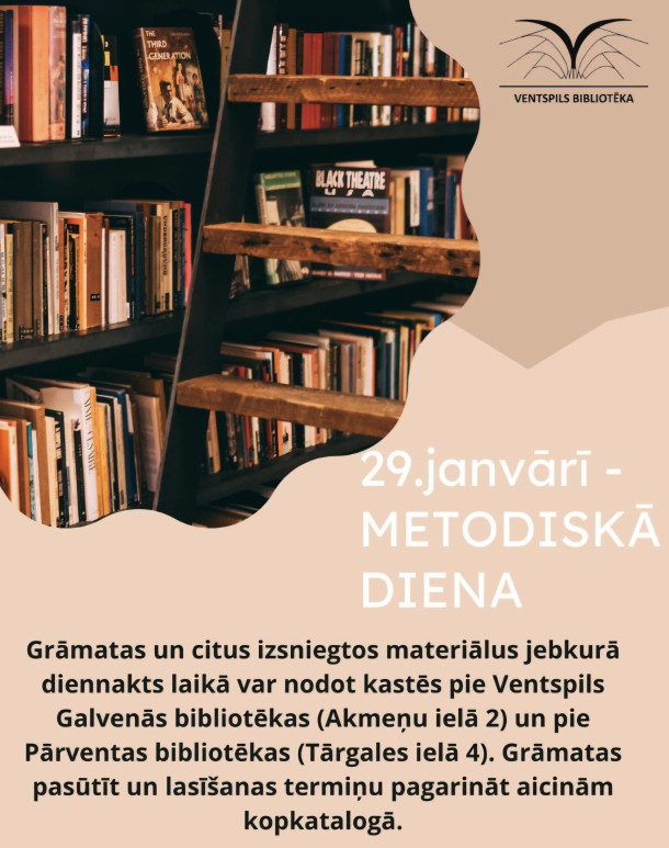Informējam, ka 29. janvārī Ventspils bibliotēkās ir metodiskā diena, un tāpēc bibliotēkas apmeklētājiem būs slēgtas.