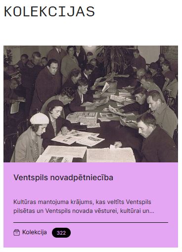 Digitālajā bibliotēkā pieejama jauna digitālā kolekcija “Ventspils novadpētniecība” - Kultūras mantojuma krājums veltīts Ventspils pilsētas un Ventspils novada vēsturei, kultūrai un cilvēkiem, atspoguļojot vietējās sabiedrības dzīvi, nozīmīgus notikumus, personības, vēsturi un kultūras mantojumu. Kolekcija apvieno dažāda veida digitalizētus un digitāli radītus objektus - šobrīd kolekcijā skatāmi vairāk nekā 300 digitāli objekti: