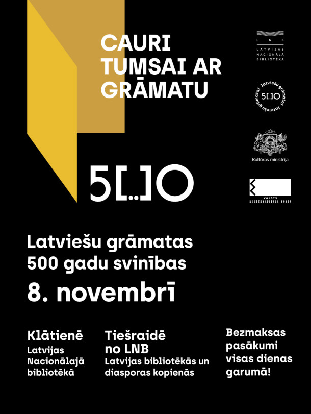 Latvijas Nacionālā bibliotēka 8. novembrī pasākumu cikla “Latviešu grāmatai 500” kulminācijas pasākumā “Cauri tumsai ar grāmatu” aicina ikvienu Latvijas iedzīvotāju un diasporas pārstāvi atzīmēt 500 gadus, kopš ir iespiesta pirmā grāmata latviešu valodā. Pasākums notiks klātienē LNB, tiešraide no LNB būs skatāma 100 Latvijas bibliotēkās, kā arī diasporas kopienās.