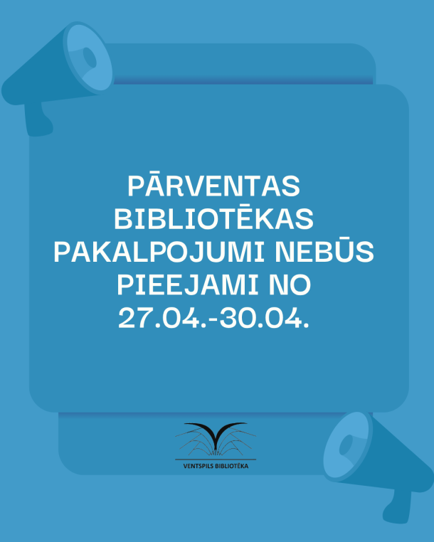 Informējam, ka no 27.-30. aprīlim sakarā ar krājuma inventarizāciju nebūs pieejami Pārventas bibliotēkas pakalpojumi (saņemt grāmatas un periodiku, kā arī izmantot lasītavas pakalpojumus).