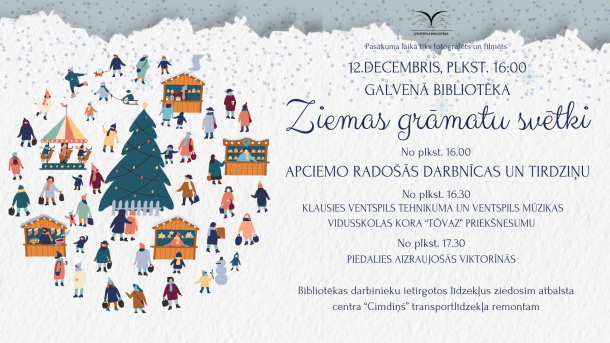 Ventspils Galvenajā bibliotēkā 12. decembrī, plkst. 16.00-18.00 notiks Ziemas grāmatu svētki. Arī šogad apmeklētājiem būs iespēja iepazīties ar Ventspils skolu skolēnu mācību uzņēmumiem, iepirkties pie mazajiem tirgotājiem, iegādāties grāmatas par izdevīgu cenu, kā arī atbalstīt atbalsta centru ģimenēm un bērniem ar īpašām vajadzībām “Cimdiņš”, iegādājoties bibliotēkas darbinieku sagatavotos labumus. Bibliotēku ieskandinās Ventspils tehnikuma un Ventspils Mūzikas vidusskolas koris “Tōvaz”.